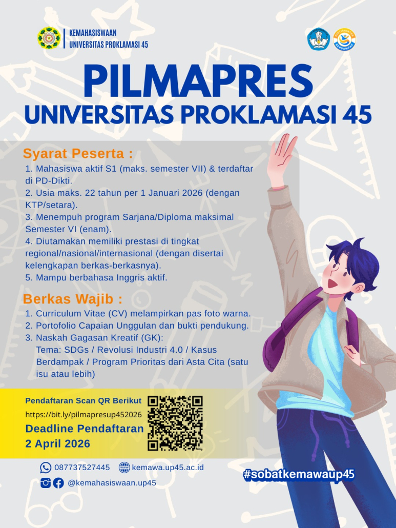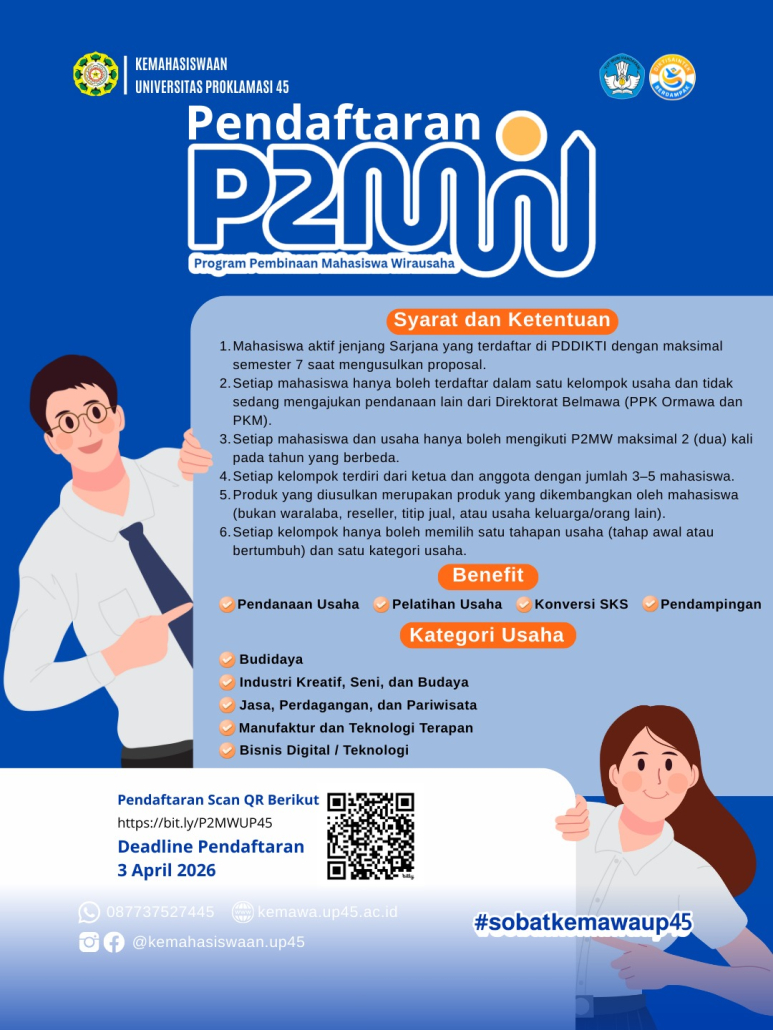 🔗 Segera lakukan pendaftaran melalui link https://bit.ly/P2MWUP45 atau scan QR pada flyer dan jadilah bagian dari mahasiswa yang berani berinovasi dan berwirausaha! Jangan lewatkan kesempatan untuk mengembangkan ide bisnis dan mendapatkan dukungan langsung dari program nasional!